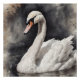 Um Cisne branco com uma aquarela detalhada com olhos expressivos é retratado contra um fundo macio e turvo. As cores naturais melhoram a aparência semelhante à vida.