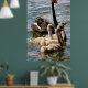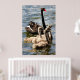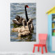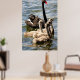Um cisne negro guarda seus jovens cinemas em um lago no final da tarde
