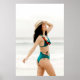 A woman in a teal swimsuit and straw hat walks on the beach. She appears happy and carefree as she basks in the ocean breeze.