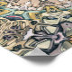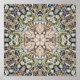 A symmetrical, kaleidoscopic design forms the centerpiece, with intricate, interconnected shapes and muted colors creating a harmonious pattern. The radial symmetry and organic shapes evoke a sense of depth and complexity.