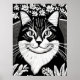 Poster num retrato preto e branco de um gato com olhos largos, num jardim rodeado de flores e folhagem.