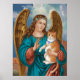 Um anjo vestido de azul está segurando uma mesa laranja.