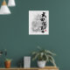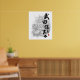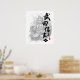Arte caligráfica de Takeda Shingen (武 田 玄), abaixo do kanji está a assinatura samurai de Shingen e o kamon do clã Takeda, Takeda bishi. Ao fundo está a estátua de Takeda Shingen, fora da Estação Kofu, no Japão.