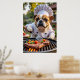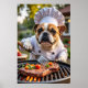 Esta imagem encantadora apresenta um Bulldog Francês bronzeado e branco, vestindo um chapéu e avental de chef branco e nítido, grelhando diligentemente um pedaço de carne em uma grade ao ar livre. Com olhos focados e espátula na pata, o adorável canino tende, experientemente, ao bife dimensionável, manchado com tomate pequeno e ervas. O vibrante ambiente exterior com luz solar quente completa esta encantadora cena culinária.