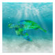 Uma tartaruga verde ameaçada nadando debaixo d'água pintada em azul oceânico e verduras com bolhas de ar flutuando em direção à superfície.
