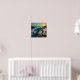Esta poster horizontal mostra um belo pôr do sol na praia com uma amistosa tartaruga marinha. Terminado em um impressão de tinta a óleo.