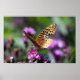 A butterfly with brown and orange patterned wings rests on a vibrant purple flower. The background is a soft focus mix of green and purple hues, suggesting a lush garden setting.