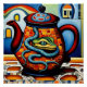 A.I. criou impressão surreal de um Panda a espreitar de um bule de chá colorido, rodeado por um mosaico vibrante de formas geométricas, padrões de matizes arrojados.
