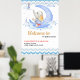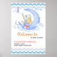 Um chá de fraldas moderno com design de aquarela ilustrando um elefante bebê sentado na lua com farol, veleiro, nuvens e começa. Este design bonitinho será uma adição divertida ao seu chá de fraldas temático náutico.