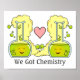 Dois frascos de química bonitos e felizes com fluido verde borbulhando o topo virado um para o outro com rostos sorridentes felizes e um coração de amor rosa entre eles. Abaixo estão as palavras que temos química em letras de cinza.