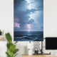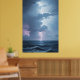 Uma pintura digital dramática retrata uma paisagem tempestuosa com um poderoso raio atingindo o oceano. O céu é dominado por nuvens escuras e giratórias, com uma ponta de rosa na distância. O raio é um branco brilhante, iluminando as nuvens e as ondas instáveis por baixo.