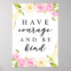 Elegante e poster de moda com citações vitais positivas e cores aquáticas, arte floral. O texto diz "tenha coragem e seja gentil." As flores pintadas pela mão são uma camélia rosa e magnólia branca. Belo e motivacional design para o seu quarto!