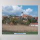 Num campo no campo húngaro, olhando para os montes e edifícios de uma cidade. As nuvens estão no céu azul, mas o tempo permanece ensolarado e quente.