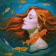 "Thalassa" - Mulheres Na Água. Nesta colorida arte feminina em imagem d'água, uma espantosa mulher com cabelo vermelho se funde com as correntes do oceano. Peixe passa pelo cabelo, simbolizando sua conexão com o mar. Sua presença exude força e inspiração, um testemunho de uma bela resiliente representação de água de mulheres fortes.