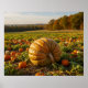 A massive pumpkin dominates the foreground of a sprawling pumpkin patch. The vibrant orange and green hues stand out under the warm light of a setting sun, with an expansive landscape in the background.