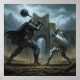 Two armored knights engage in battle amidst a stormy backdrop. The landscape features ruins and mountains, adding drama to the scene.