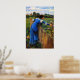 It is a painting about small pleasures and private focus. The vivid blue of the dress anchors the composition, drawing your eye to the act of picking, while the open meadow and distant rooftops create a sense of space, peace, and unhurried time.