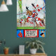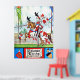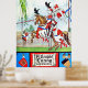 A colorful vintage medieval poster featuring a knight in full armor riding a horse and holding a lance.
