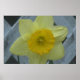 Single Daffodil in full bloom in front of white lattice.