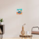 Arte de Muro de Colagem Moderna. Esta é ícones retrorreflectores antigos com avião vintage e carro azul, com tigre, cacto, deserto, planeta, papagaio e flores. Cores de laranjas, azuis e pêssego. Divertido, mod e efemémia eclética. Esta é uma superfície plana com um acabamento de canvas liso. Arte divertida e surreal usando uma mistura de técnicas de colagem e arte digital, com uma sensação retrorreflectora vintage, do século médio.