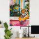 Descubra uma pintura minimalista cativante de um tigre relaxando numa banheira, colocada contra um pano de fundo vibrante de jardim tropical. Este poster de grande escala apresenta cores ousadas, elementos gráficos e linhas expressivas, criando uma peça única e sofisticada de arte em parede.