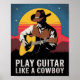 poster de "Tocar Violão Como Um Cowboy", não pelos meus primeiros Impressões de Rodeio. Mergulhe no Oeste Selvagem com um trabalho de arte vibrante com um caubói amarrando seu violão contra um incrível pano de fundo do pôr do sol. A paleta retrorcolorida e a vibração clássica ocidental evocam um sentido de liberdade e aventura. Perfeito para aqueles que vivem por música country e encanto rústico, esta peça adiciona um toque ousado a qualquer espaço. Deixe o espírito da fronteira inspirar sua decoração e trazer uma fatia de Americana para sua vida.