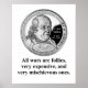 Design apresentando uma imagem de Benjamin Franklin e a citação: Todas as guerras são loucuras, muito caras e muito maliciosas.