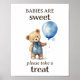 Torne o seu chá de fraldas ainda mais especial com este adorável poster "Bebês são doces, tratem"! Apresentando uma doce ilustração aquosa de um ursinho de pelúcia fofo com um balão azul, este cartaz charmoso é a adição perfeita à sua sobremesa ou favorece a mesa. Ordene o seu hoje para adicionar um toque final encantador à sua comemoração!