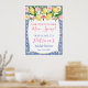 Aquarela de limões e rosas cor-de-rosa e peônias contra um fundo de padrão de azulejo azul cobalto e branco para este elegante sinal de boas-vindas de Chá de Noiva ou Chá de Bebê.