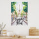 Uma pintura a aquarela representa uma rua parisiense arrebatadora com a Torre Eiffel ao fundo. Pessoas caminham pela calçada sob a sombra de árvores, criando uma cena viva do dia a dia na cidade.