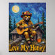 Esta encantadora pintura retrata um urso vestido de bombeiro, usando óculos de sol e capacete, tocando violão no topo do telhado de uma cabana aconchegante. Uma lua cheia proeminente brilha no céu azul escuro texturizado, ladeada por pinheiros altos. Um pote de mel está na base da cabana. Os pinceladas grossas e texturizadas ressaltam a natureza caprichosa e doce da cena, com "Amo Meu Mel" exibido de forma proeminente.