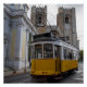 Tradicional elétrico amarelo em frente à Catedral de Lisboa, Portugal.