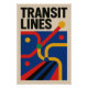 Trois lignes — rouge, jaune, bleue — se croisent dans un enchevêtrement fluide sur fond bleu électrique. Des ronds marquent les stations dans un esprit de signalétique urbaine joyeuse. Le titre "TRANSIT LINES" s’impose comme un élément graphique à part entière. Une version plus ludique, plus colorée et pop du monde souterrain du métro.