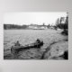 Foto antiga de caçadores com veado na canoa. O Hotel de Paul Smith, as Montanhas Adirondack estão ao fundo, em 1903.