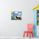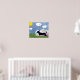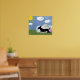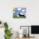 Este cachorro feliz estilo cartoon preto e branco corre ao redor das bolas neste esporte de cachorro de Treibball. O simples poster é brilhante e alegre apresentando o cão na grama verde, nuvens brancas puffy, céu azul texturizado de fundo, sol amarelo e silhuetas de pássaros voando sobre a cabeça.