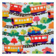 Trens fofos em trilhos com grandes árvores em fundo azul.