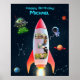 3-2-1... Exploda! Chamando todos os astronautas para celebrar e viagem pelo espaço. Surpreenda com esta fabulosa ilustração espacial. Crie uma terceira colagem de fotos de aniversário em um grande número três. Substitua as imagens de exemplo por suas próprias imagens. Esse design apresenta um cenário de espaço noturno com planetas, estrelas e constelações. Voe com um foguete espacial próximo a um disco voador com uma alienígena verde e um astronauta. presente de aniversário de 3 anos excelente. Colagem de fotos número 3 personalizada para um produto exclusivo e muito especial.