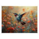 Um vibrante design de dissociação por aquarela, com um beija-flor arruinado, pairando entre flores delicadas, capturando a graça e a energia da natureza em floração.