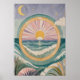 This vibrant, illustrative piece combines nautical scenery with mystical celestial symbols. At its center, a large circular window frames a tranquil sunrise or sunset over rolling ocean waves, rendered in a soothing palette of teal, seafoam, and lavender. Outside this frame, lush tropical foliage and palm fronds anchor the foreground, while the upper sky transition into a twilight scene featuring a golden crescent moon and shimmering stars. The artwork utilizes a mix of flat graphic shapes and soft watercolor textures, creating a peaceful, dreamlike coastal atmosphere that feels both modern and mythical.