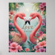 Uma cena tropical vibrante com dois flamingos formando um coração, cercado por um verde-luxuoso e flores. Amantes de os animais Perfeitos para decoração romântica e com tema de praia.