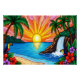 Add a burst of color and sunshine to your space with this stunning tropical sunset poster, inspired by the beauty of stained glass art. The glowing sun dips into a tranquil ocean, radiating vivid shades of orange, gold, pink, and blue — framed by palm trees, lush greenery, and a cascading waterfall.