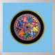 A hand painted geometric mandala featuring spiraling layers of unfolding rainbow coloured petals over an indigo coloured universe circled by a rich gold border.