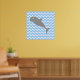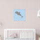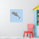 Um desenho animado de um tubarão-cinza com um fundo de padrão ziguezague azul claro e branco.