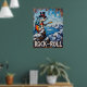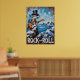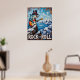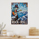 Esta trabalho de arte de whimsical apresenta um tubarão legal vestindo um chapéu e óculos de sol, tocando uma guitarra elétrica em uma montanha de neve sobre um mar azul e gelado. O fundo mostra picos distantes de neve sob um céu nublado. A pintura usa pinceladas grossas e texturizadas, dando uma sensação divertida, porém dinâmica, à cena, com "ROCK and ROLL" gravado abaixo.