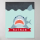 Este lindo pôster de arte para berçário e quarto de crianças apresenta um fundo azul-marinho com um tubarão de boca aberta debaixo da água azul-claro e uma nadadeira de tubarão acima da água. Personalize de acordo com as suas necessidades. Você pode encontrar mais produtos compatíveis na minha loja.