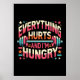 Ideal para entusiastas do ginásio, elevadores de peso e fãs de malhações que podem se relacionar com a dor e a fome de treinamento intenso. Uma escolha excelente para visto casual, roupa de exercícios ou como um presente divertido para amigos e familiares que amam malhações. Celebre a moda com a design "Tudo Magoa e Estou Fome"! Este gráfico ousado e cheio de humor captura a experiência compartilhada de empurrar seus limites na academia e lidar com o que aconteceu depois. Apresentando um sino anglorioso e cartazes dinâmicos, esta design é uma mistura perfeita de orgulho malhação e humor relacionado. Quer você esteja se recuperando do dia das pernas ou simplesmente abraçando o estilo de vida malhação, este design é seu crachá de honra.