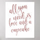 Um sinal de casamento elegante e moderno, apresenta o texto "Tudo o que você precisa é amor e um cupcake" em uma fonte de letra extrovertida, a textura brilhante adiciona um toque festivo e glamoroso. A cor do fundo pode ser personalizada de acordo com as suas necessidades e preferências, por favor entre em contato se tiver algum pedido especial.