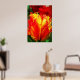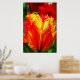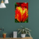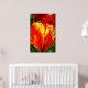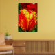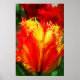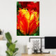 Composição poster colorida com tulipa encaracolada brilhante e duas cores brilhantes. A imagem é uma captura próxima, ou macro, que expõe muito claramente as pétalas de uma arquitetura sofisticada com bordas finamente incitadas, linhas de textura fina e complicadas intricações amarelas vermelhas. As bordas incisadas e a paleta de cores vibrantes lembram um papagaio espumante, que é a origem do outro nome da flor, tulipa de papagaio. Também conhecida como "Cura-encaracolada" ou tulipa franzida, esta linda flor mostra cores intensas e extravagantes quase brilhando sob os raios solares do dia do médio de maio.