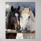 Poster with an illustration of two horses on a snowy winter ranch with a full moon in back of them standing behind an old rustic fence.