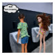 Duas pessoas estão em uma banheiro masculino, observando uma à outra usando os mictórios, com uma vestindo um vestido curto e parecendo muito com uma mulher. Uma com uma bolha de pensamento que diz "Uau, isso é inesperado."